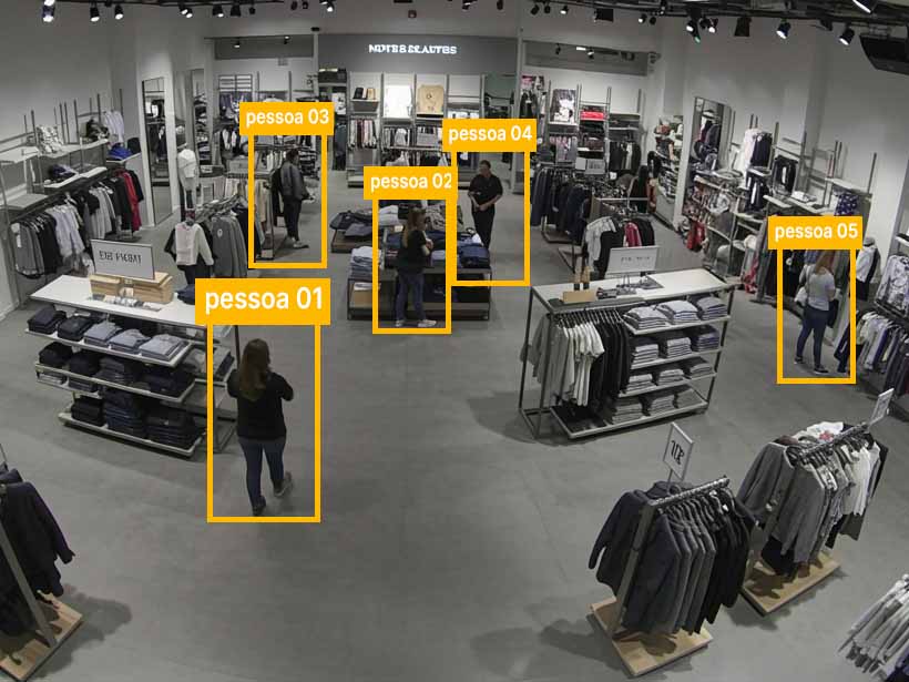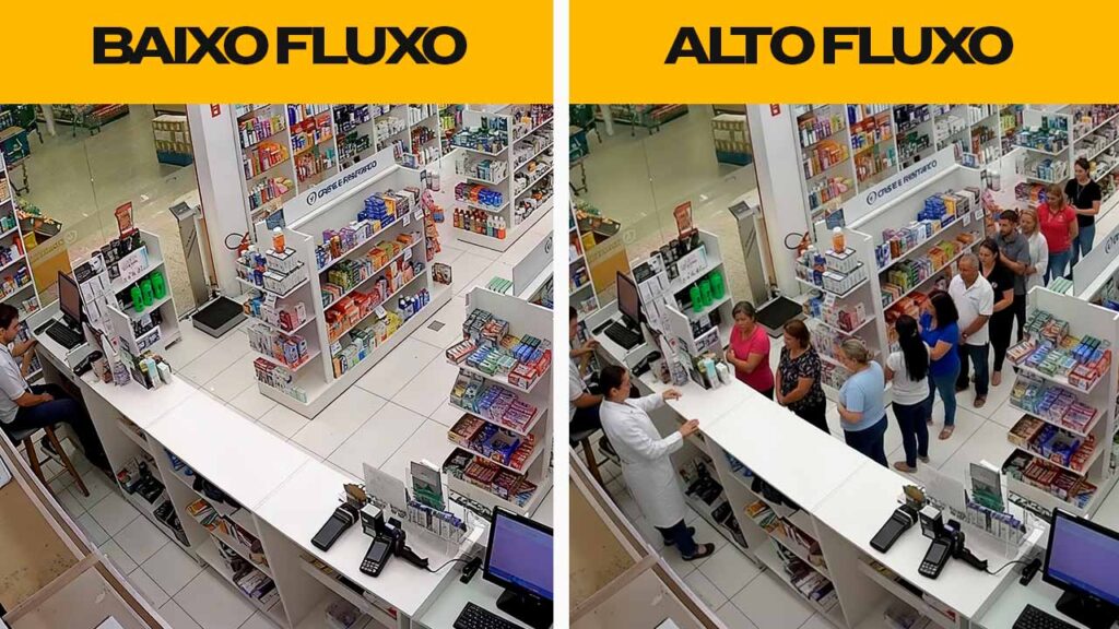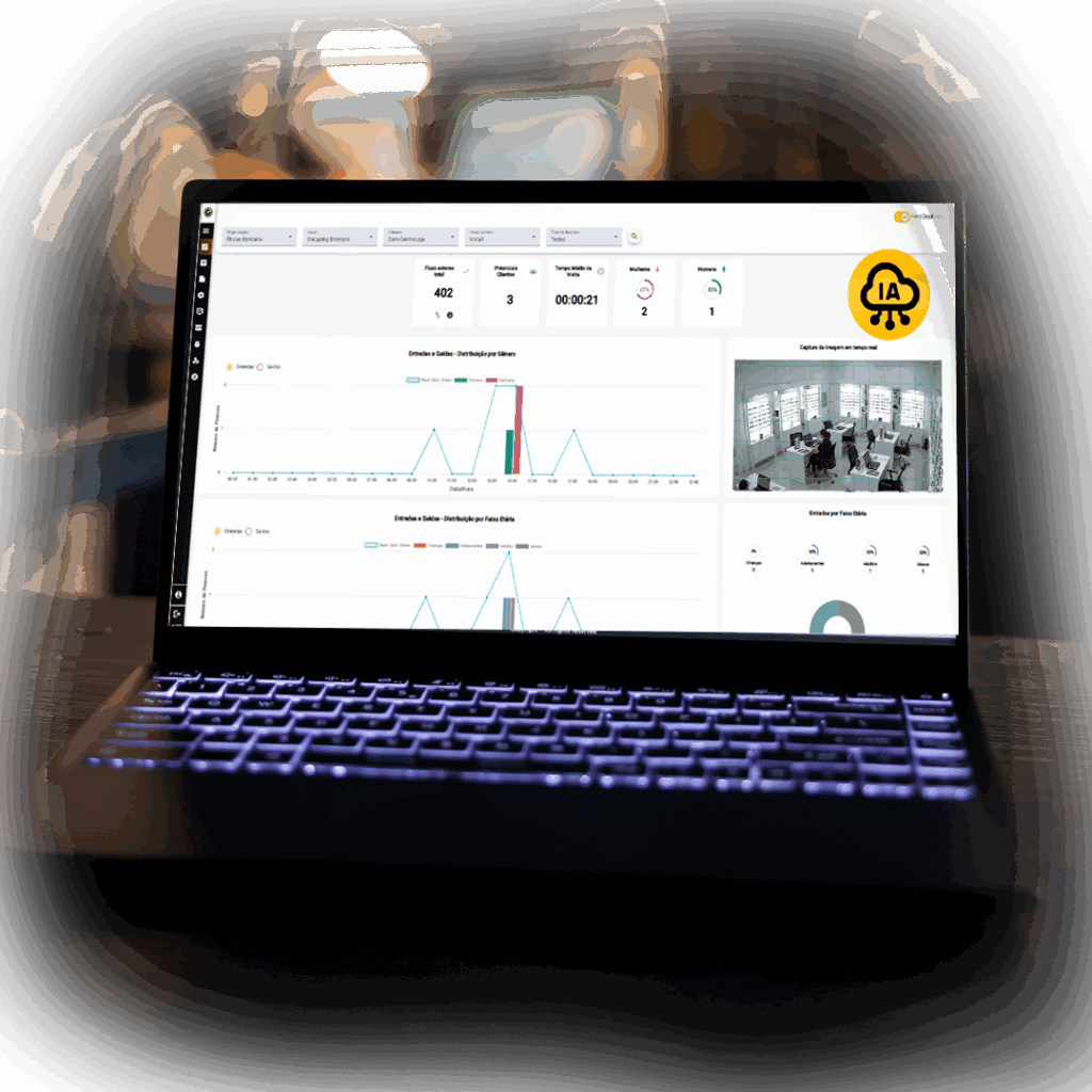 A IA conta pessoas, identifica picos e padrões e gera comparativos por loja e dia.